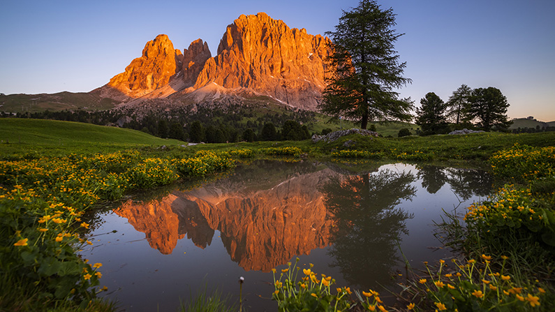 Beginning in April, the landscape undergoes a stunning transformation from a winter wonderland into one full of surprise lakes and wildflowers. As the snow begins to melt, it collects in the meadows below, forming crystal-clear lakes. These lakes, however, are only temporary– act fast, as they tend to disappear nearly as quickly as they appear. For the best chance of sighting one of these mysterious lakes, hire a guide who knows which ones are still around. If you’re lucky, you might catch the Lech de Ciampedel, a turquoise lake at the base of a craggy peak.