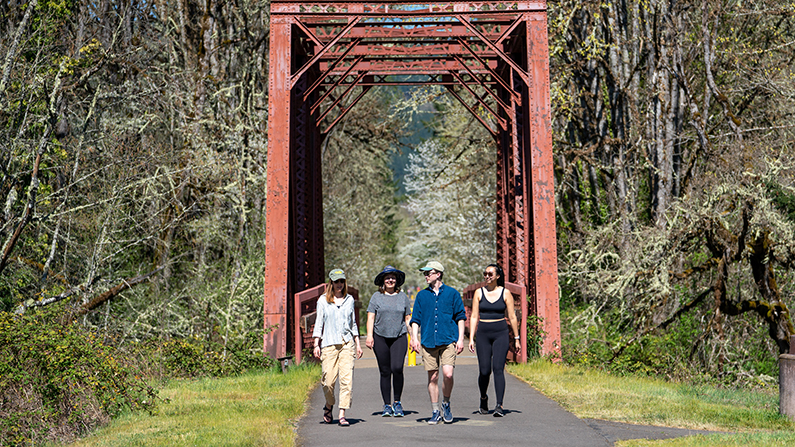 Looking for more bridges? We’ve got you covered: take a lap on the 36-mile Covered Bridge Scenic Bikeway. The full route begins in historic downtown Cottage Grove and loops around Dorena Lake. This includes sections of shared roadways, but part of it can be done as an out-and-back trip along the Row River Trail, a bike/pedestrian-only path along the north side of the lake. As the name suggests, riders will encounter historic covered bridges all along the route, including the Chambers Bridge, the only covered railroad bridge in the west.