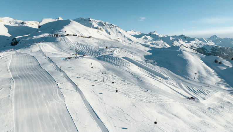 Crans-Montana isn’t a single mountain so much as a sprawling, interconnected resort spread across five sectors: Cry d’Er, Violettes, Bellalui, Aminona, and Plaine Morte. The terrain stretches across gentle beginner zones, wide-open cruisers, and steep leg-burners so good that the World Ski Championships will be hosted here in 2027.